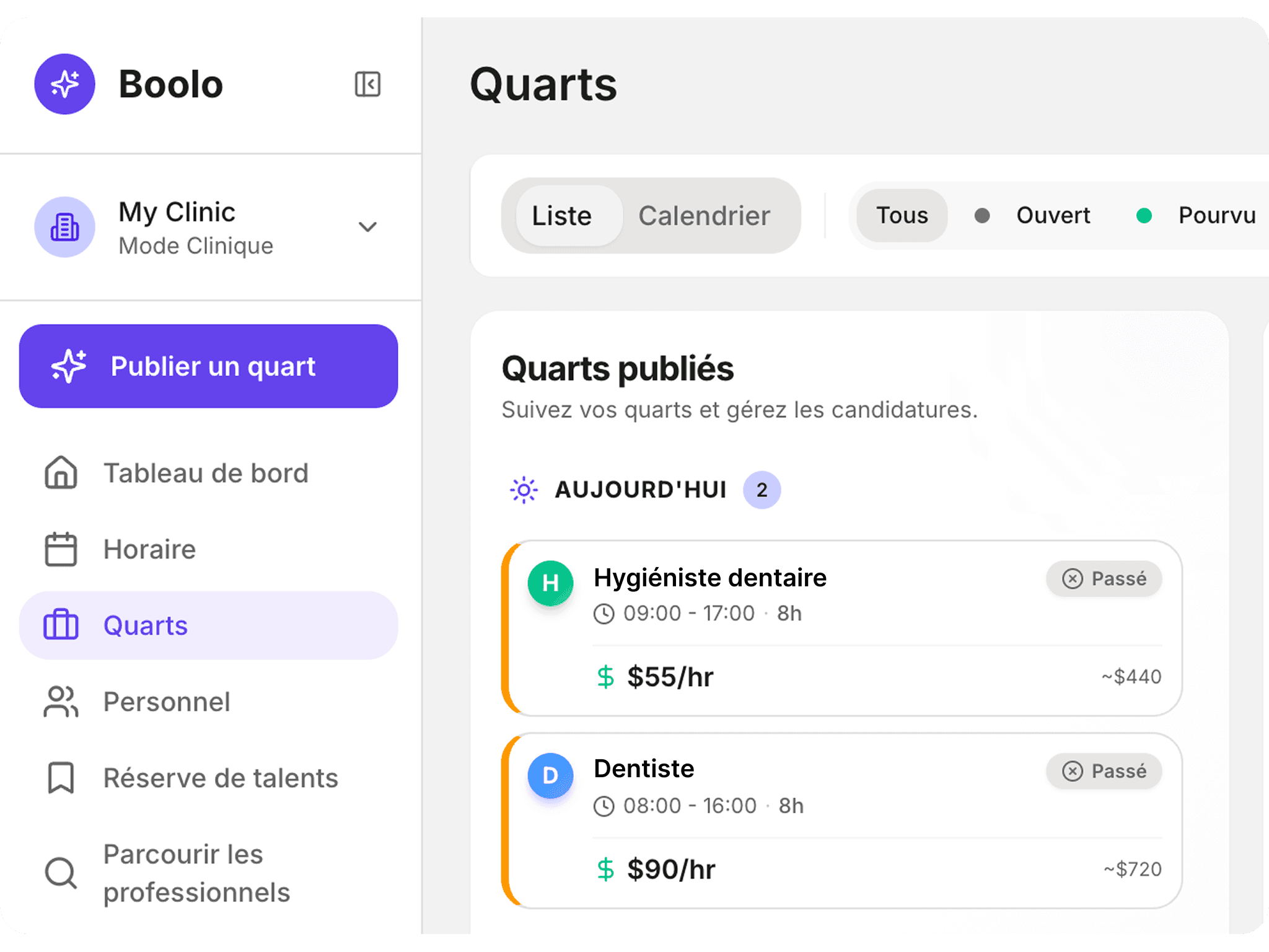 Track active professionals, upcoming shifts, and staffing gaps across your clinic or group.